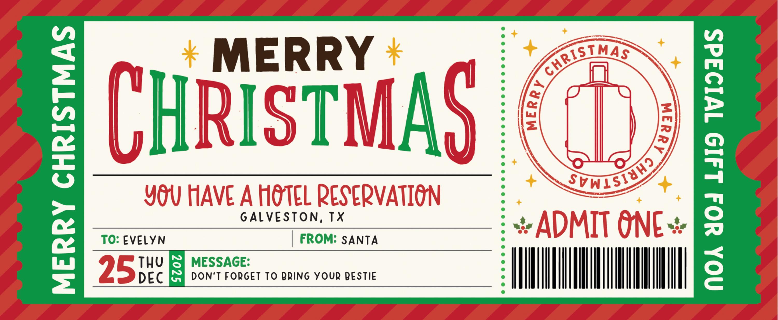 Make your trip announcement unforgettable with this Christmas hotel reservation ticket—a surprise trip reveal voucher that prints beautifully at home. Perfect holiday gift idea for spouses, parents, kids, or Secret Santa who love experience gifts and travel.
